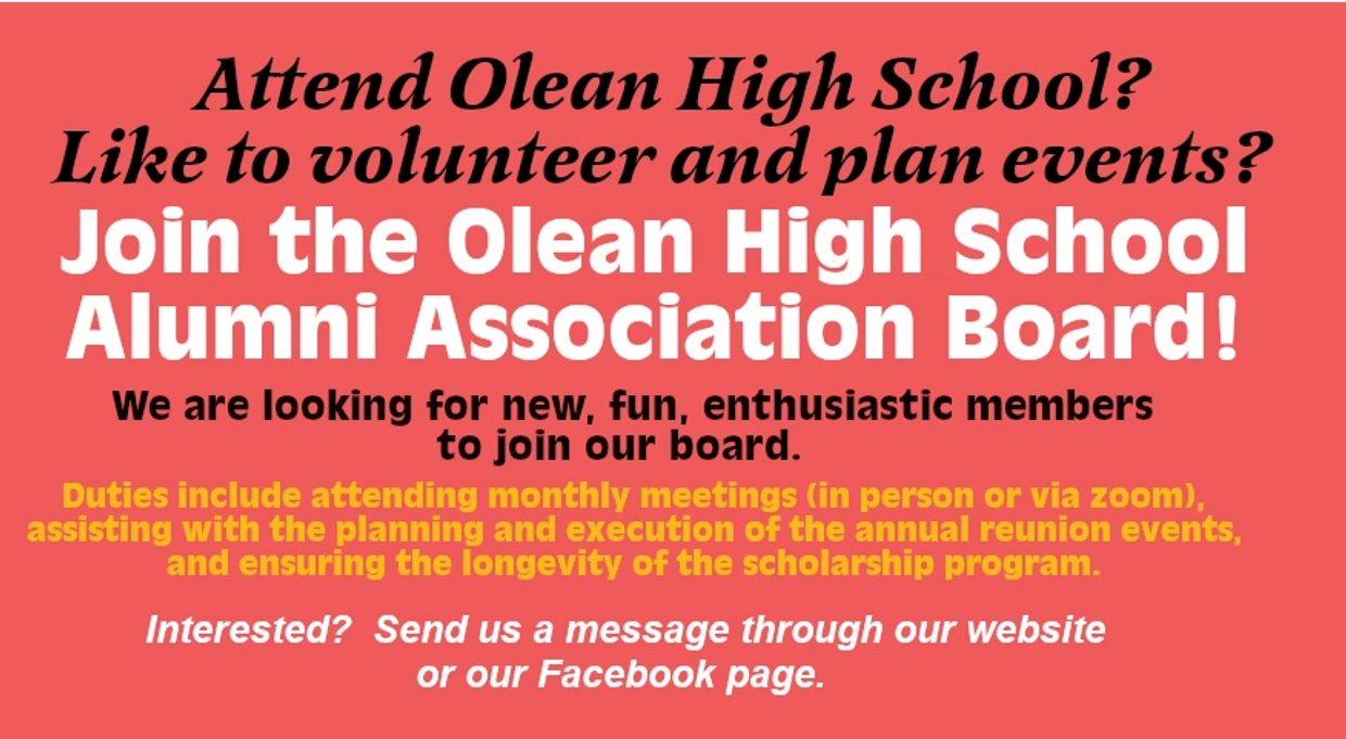 The Olean High School Alumni Association supports recent Olean High School graduates by awarding multiple $1,000 scholarships, renewable for up to four (4) years.